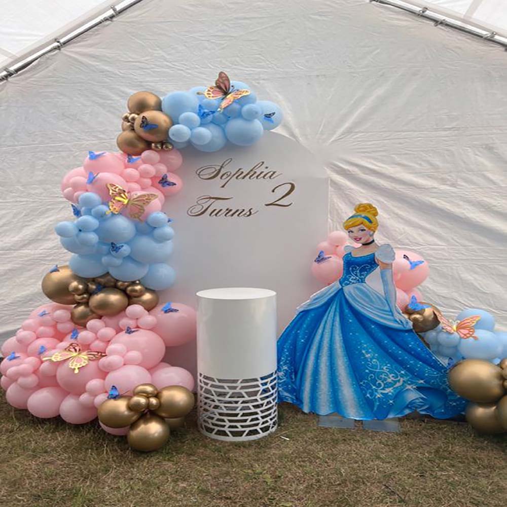 A Cinderella-themed balloon decoration is a magical and enchanting way to bring the beloved fairytale to life at any event. Imagine a stunning display of blue, pink, and golden balloons, evoking the elegance and charm of Cinderella's iconic ball gown and the enchanting world of the fairy godmother.